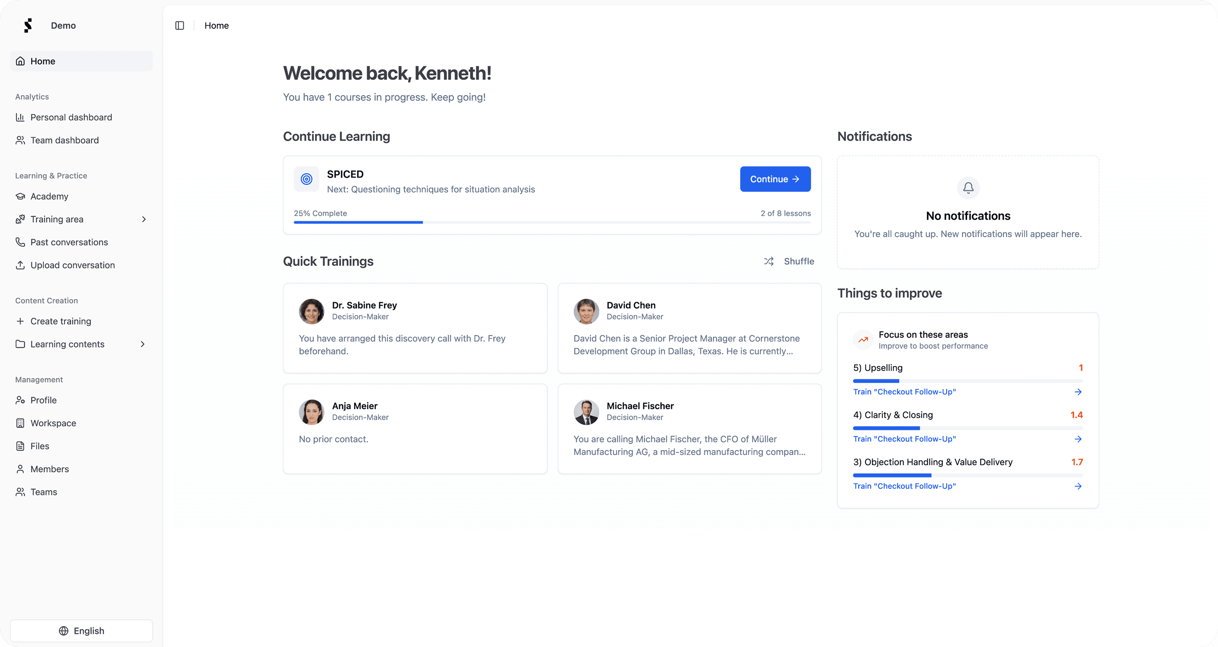 I discovered Setero a few months ago, integrated it into my daily sales routine, and have already recommended it to others on multiple occasions. Training is crucial for sustainable success in sales, especially when there is limited time for personal coaching. With Setero, I can tailor the training 100% to our use cases.