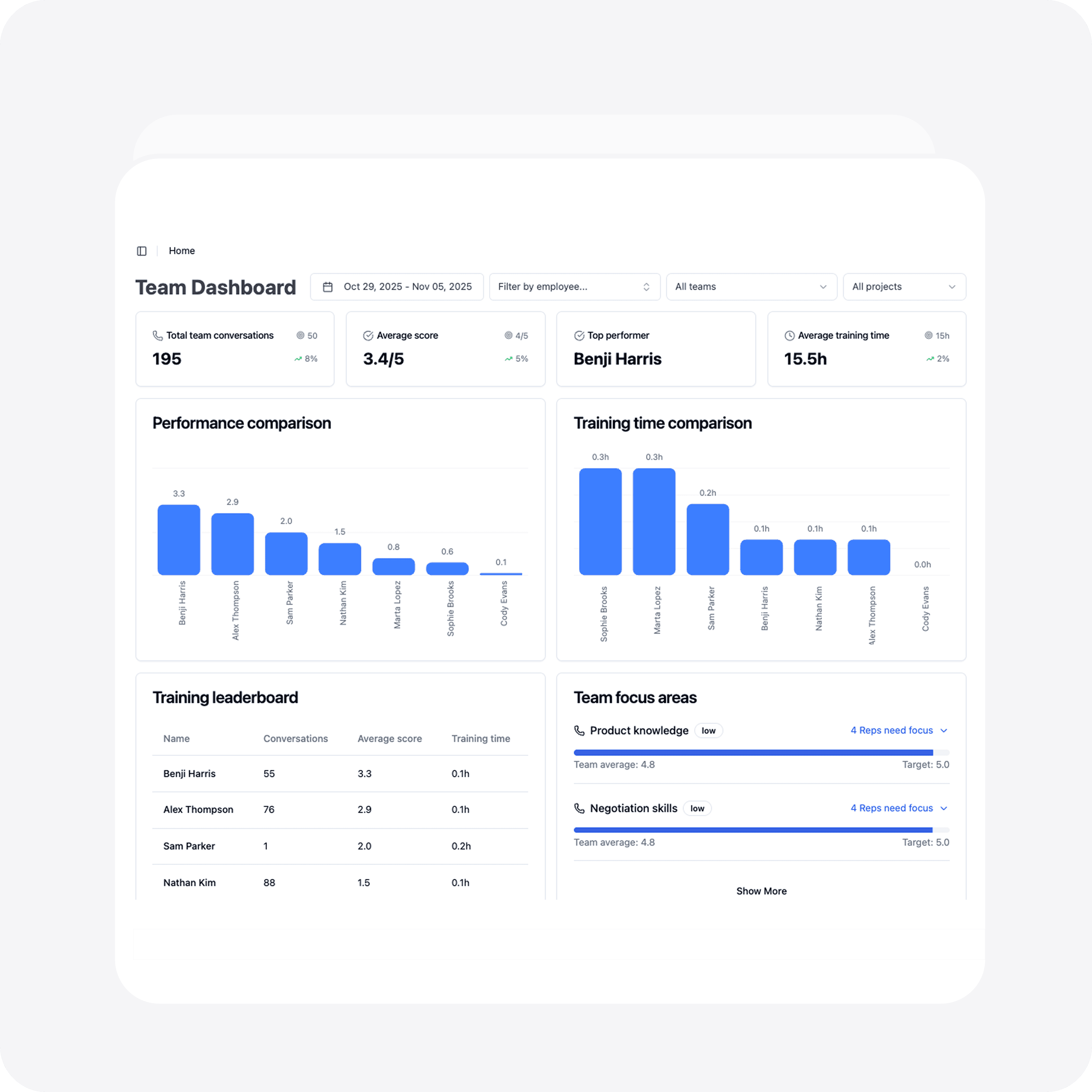 With realistic AI role-plays, teams can practice critical customer interactions — flexible, personalized, and grounded in real-life situations.